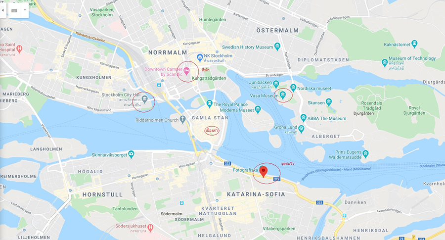 แผนที่ย่านที่เราเที่ยวชมในสต๊อกโฮล์ม (วงกลมแดง)